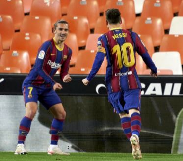 巴塞罗那的安托万·格里兹曼(Antoine Griezmann)和梅西(Lionel Messi)在西甲联赛第二场对瓦伦西亚的进球后庆祝